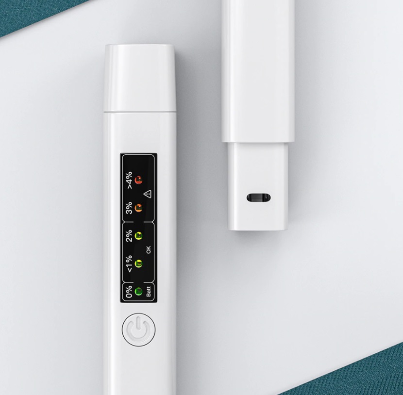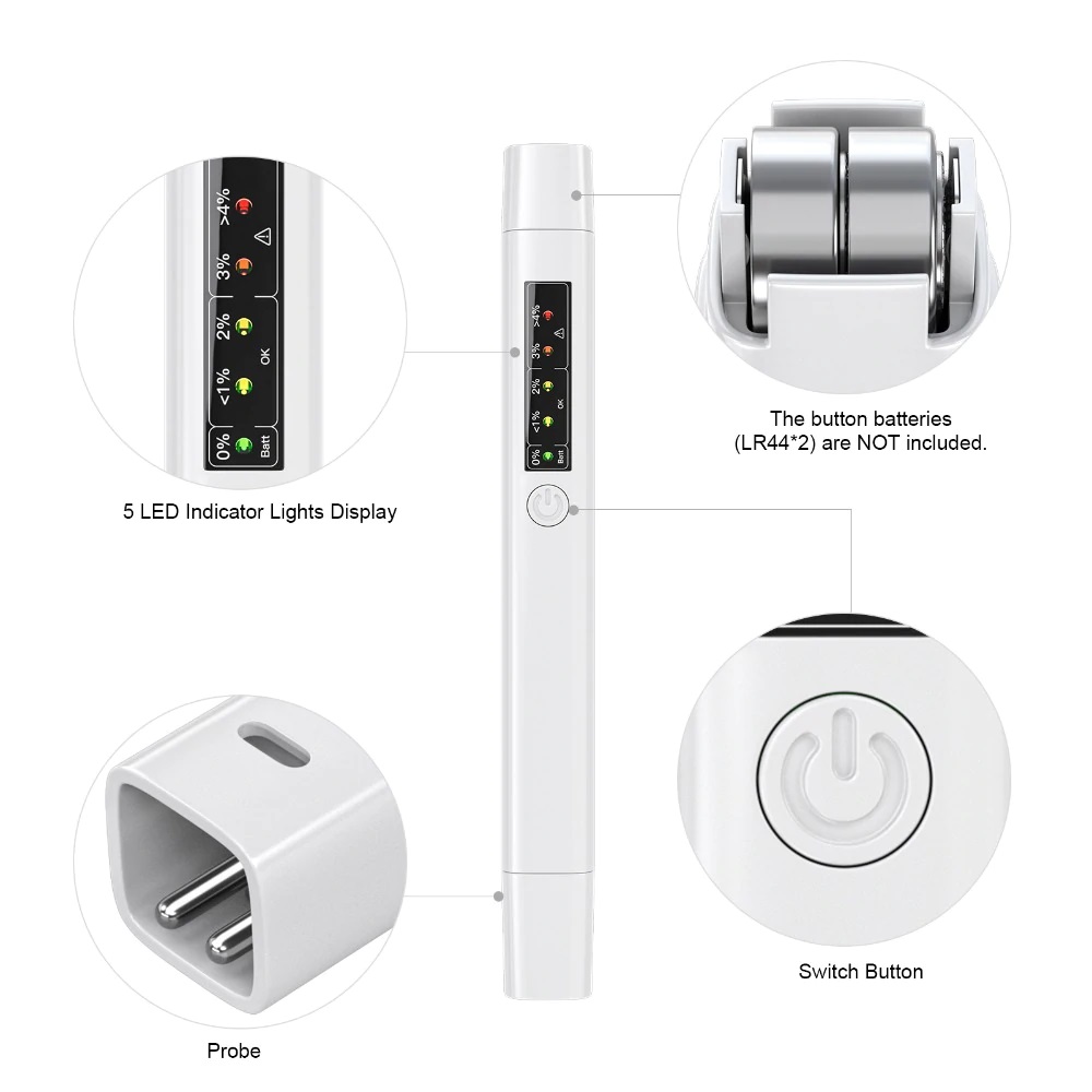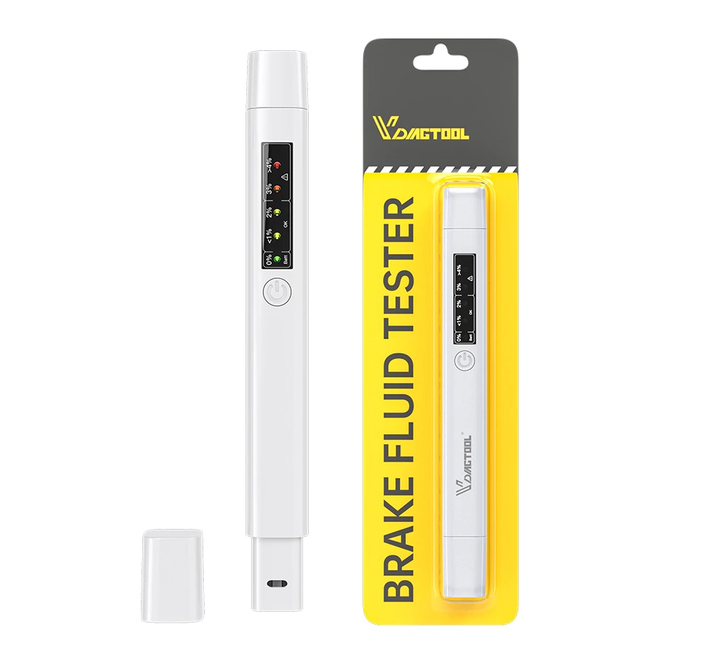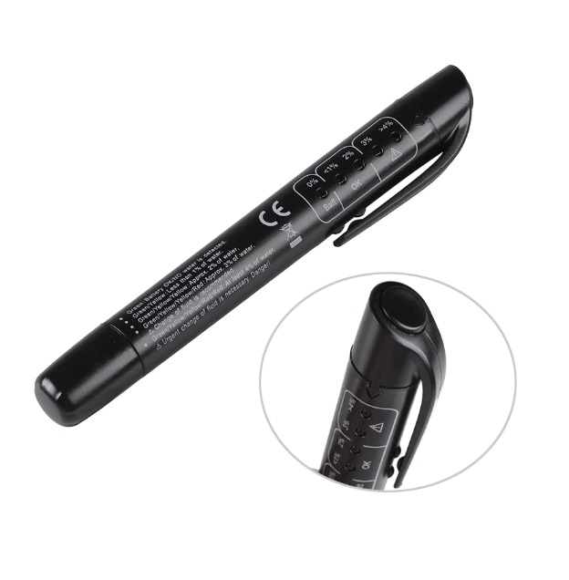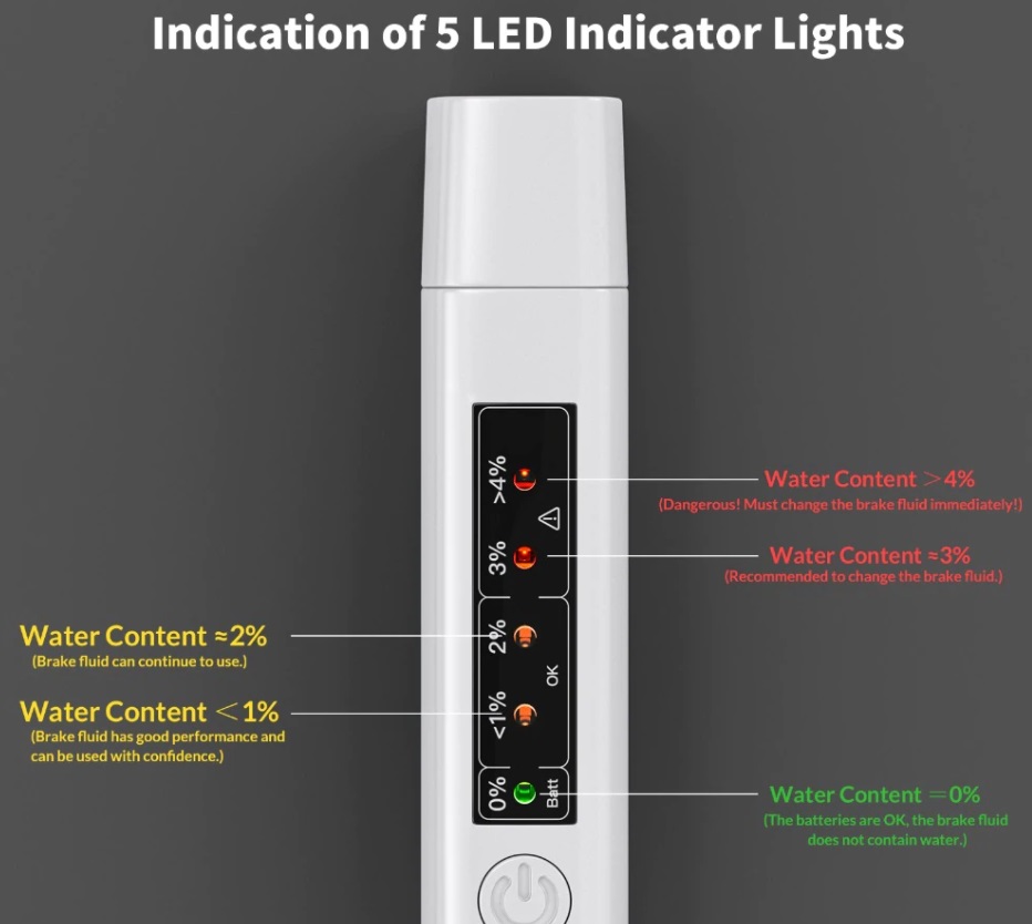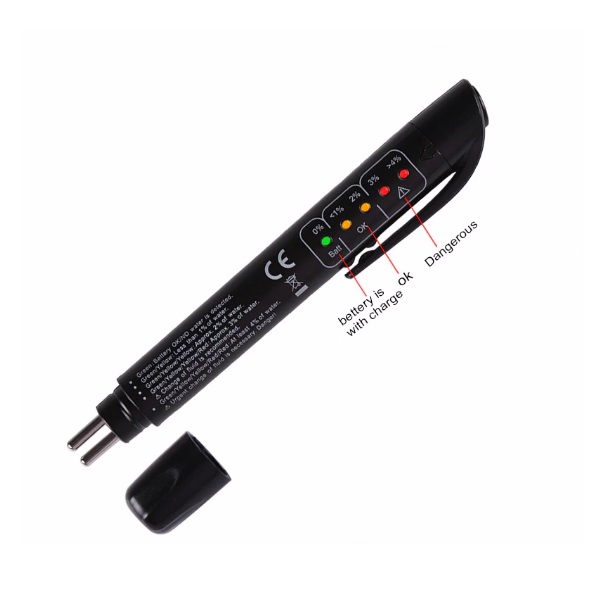 Процентное содержание воды показывается диодными индикаторами (5 светодиодов): 0%, <1%, 2%, 3%, >4%. Подходит для работы с тормозными жидкостями: DOT3 DOT4 DOT5.1