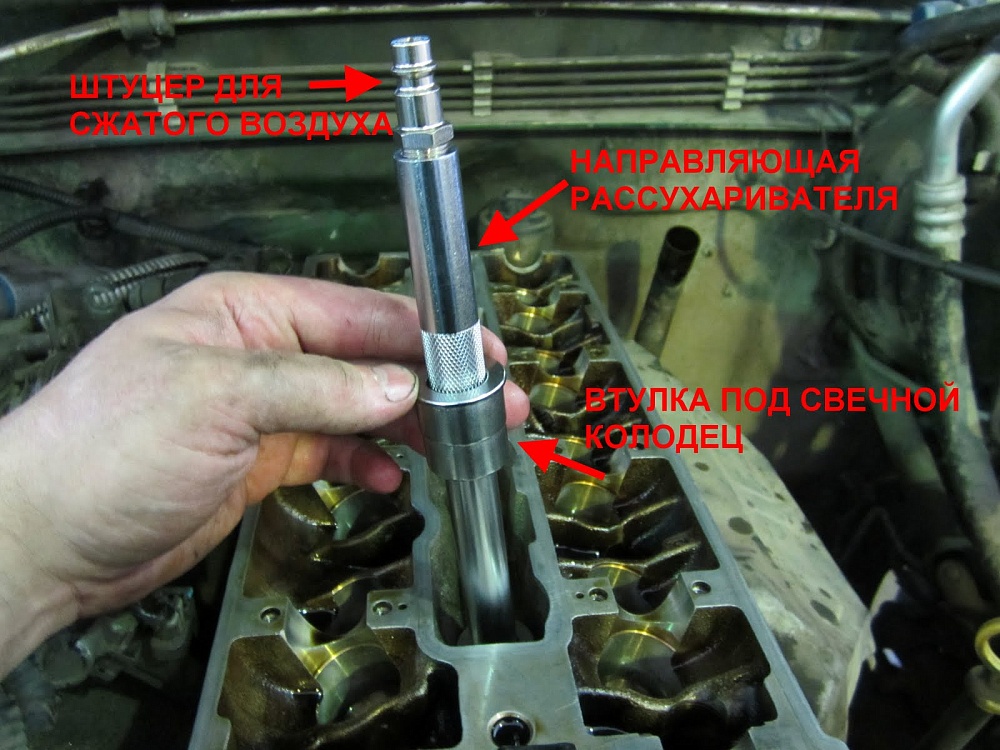 На подготовленную к рассухариванию головке блока, устанавливаем в свечное отверстие, направляющую рассухаривателя и опорную втулку.