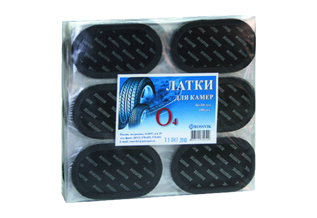 Овальные заплаты для автомобильных камер: размер - 46х80 мм, кол-во в упаковке - 100 шт. Латки Rossvik применяются для ремонта разрывов автомобильных камер любого типа.