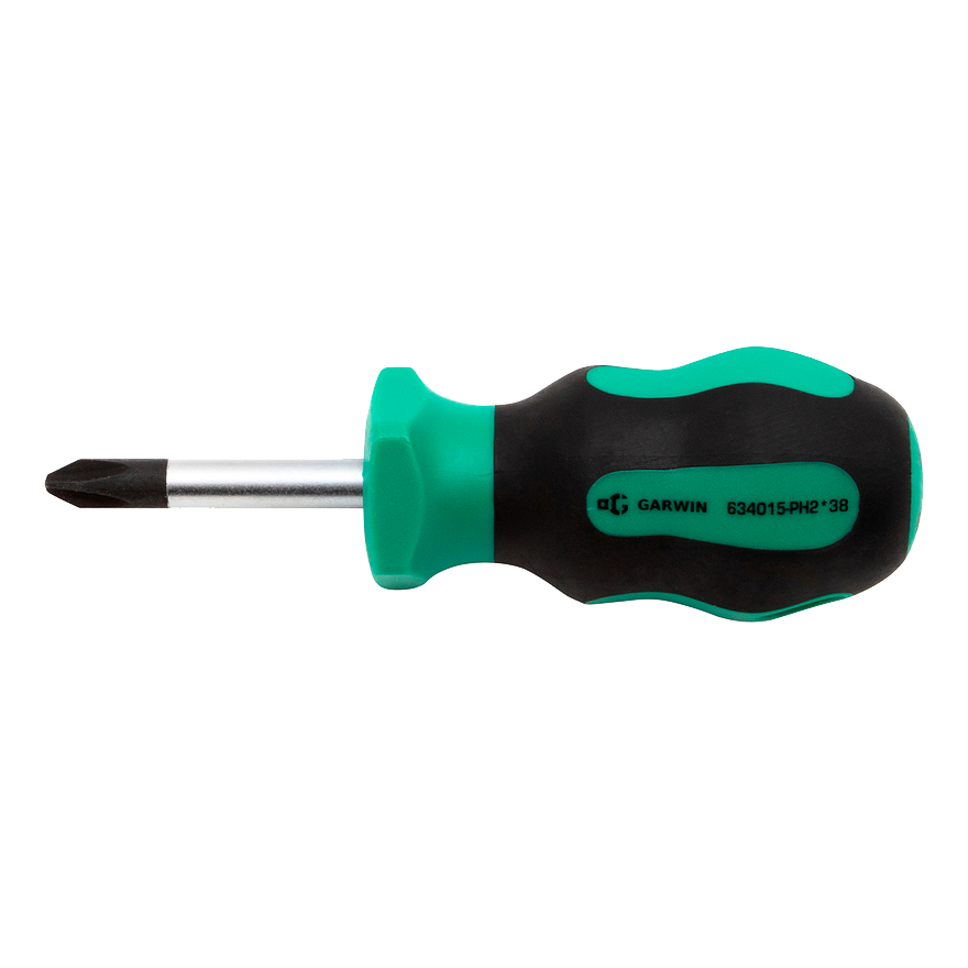 Отвертка профессиональная короткая Garwin 634015. Длина жала - 38 мм, рабочий профиль - PH2 (крест).