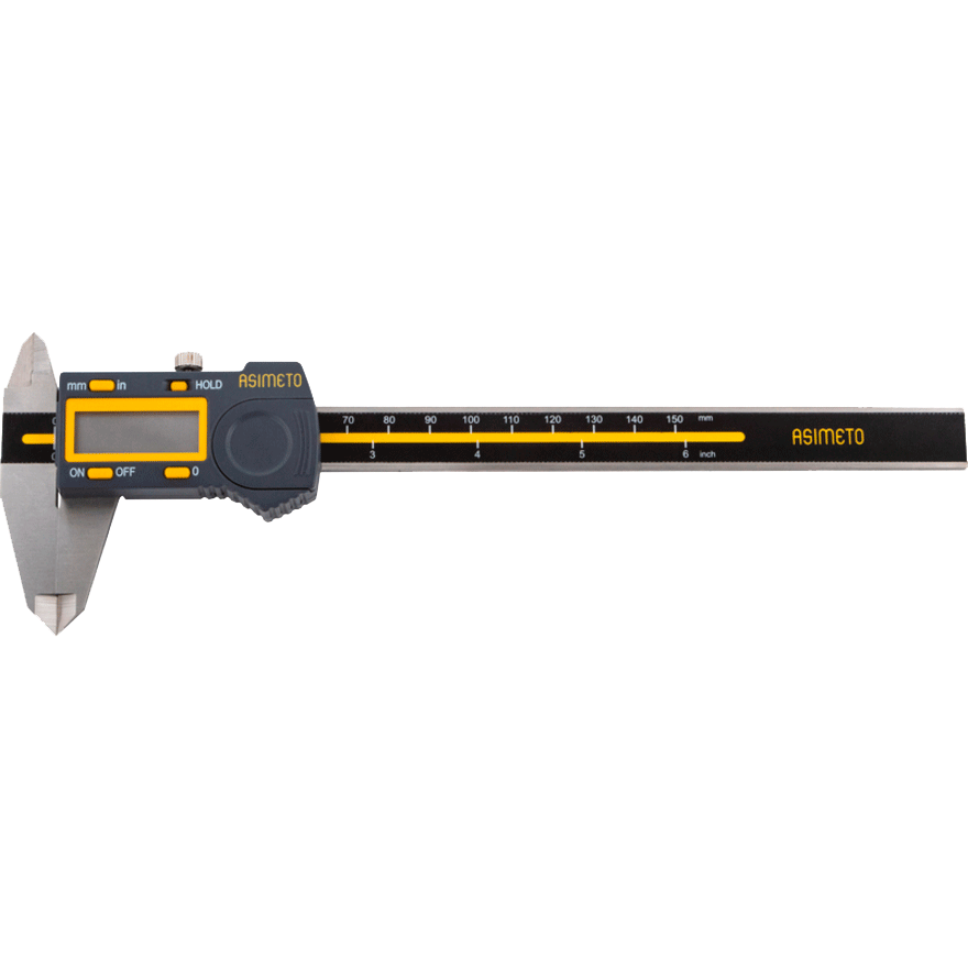 Цифровой штангенциркуль ASIMETO 307-06-5 для измерения наружных и внутренних размеров. При работе с цифровыми штангенциркулями результат измерений отображается на дисплее. Инструмент используют, когда данные необходимо получить быстро, без расчёта дополнительных шкал