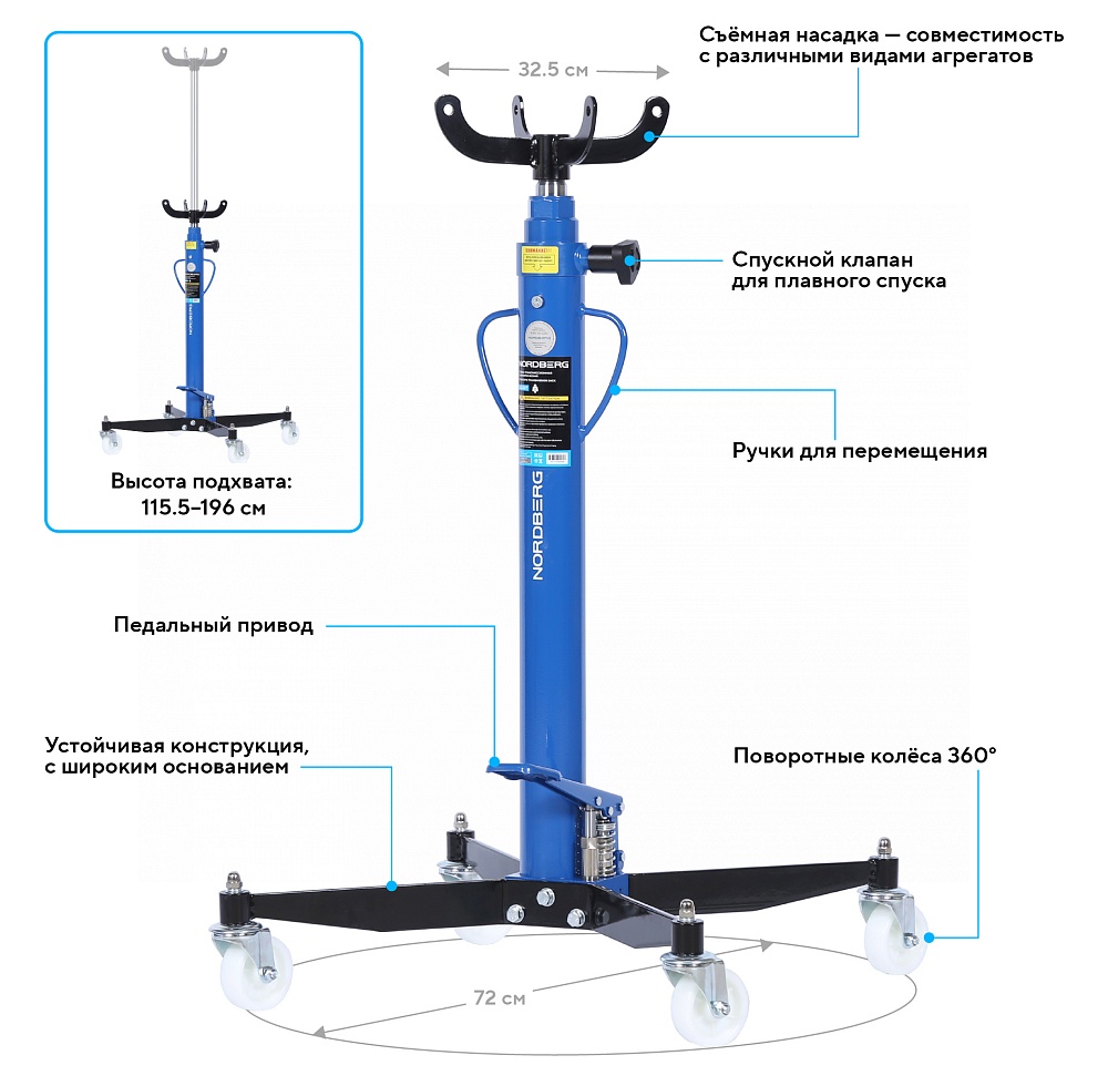 Диапазон высоты: от 1155 до 1960 мм — обеспечивает гибкость при работе с разной высоты;