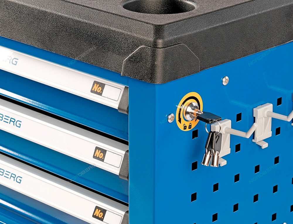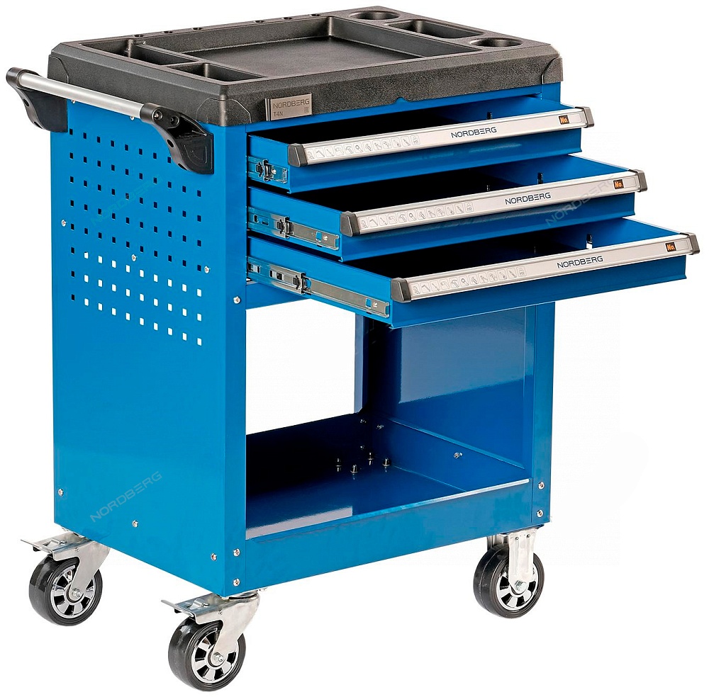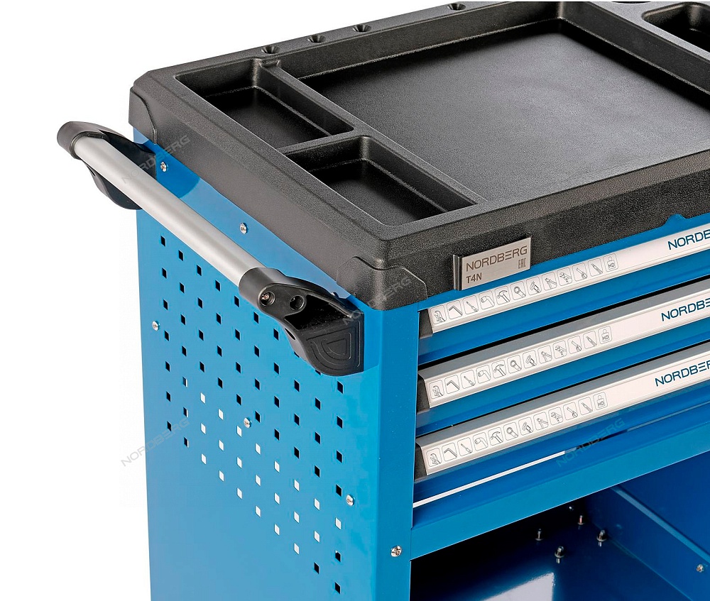 Одна из боковых стенок тележки имеет перфорированную панель, для крепления на ней крючков для инструмента . Крючки идут в комплекте с тележкой.