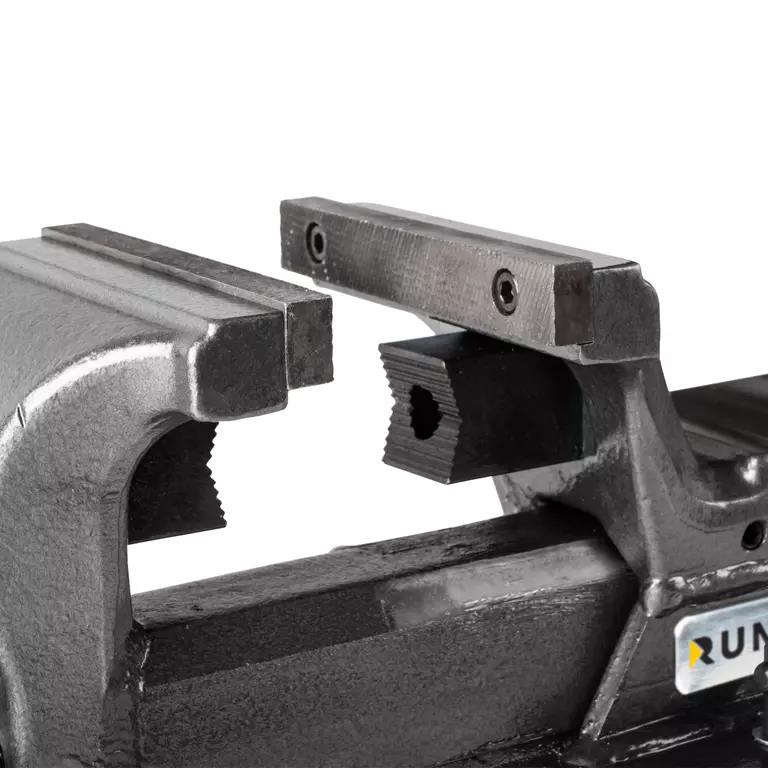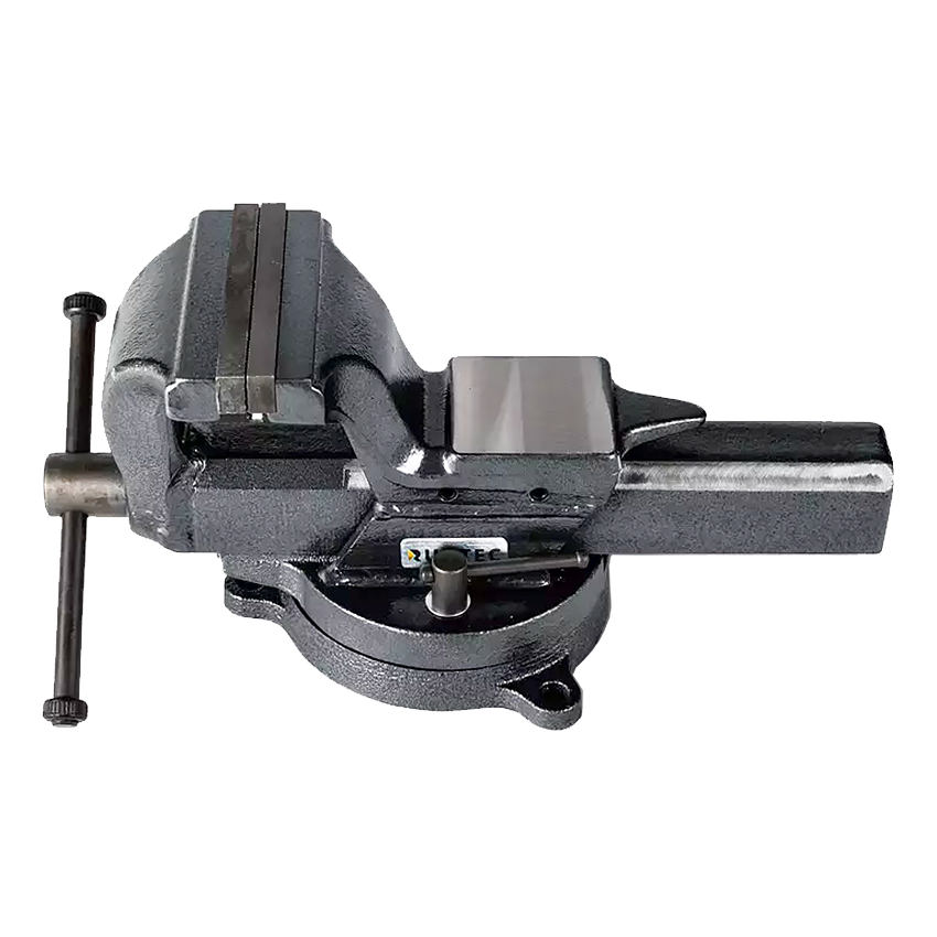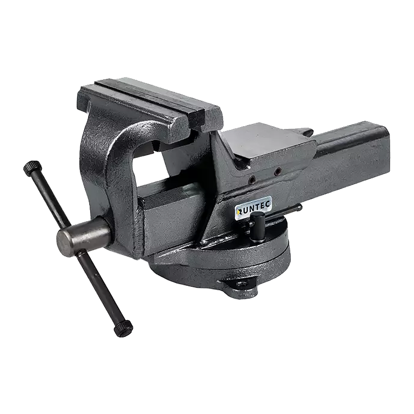 Тиски слесарные из углеродистой стали, кованые, с поворотным механизмом, съёмными губками и наковальней.